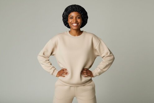 Die KF Satin Schlafmütze ist eine beidseitig tragbare Satin Bonnet, die deine Haare nachts zuverlässig vor Reibung, Frizz und Haarbruch schützt. Egal ob Afro-Hair, Locken, Waves, glattes, gefärbtes, geglättetes oder chemisch behandeltes Haar. Durch das extra glatte Satin Material von KF bleibt mehr Feuchtigkeit im Haar, Styles halten länger und dein Haar fühlt sich morgens geschmeidiger und weniger strapaziert an.